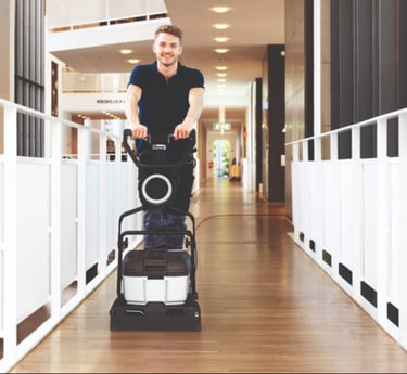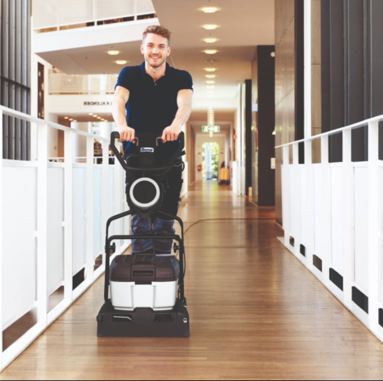 La máquina Bona Power Scrubber junto con la una fórmula limpiadora concentrada no tóxica Bona Deep Clean Solution, se utilizan para eliminar la suciedad más incrustada de los pisos de madera.